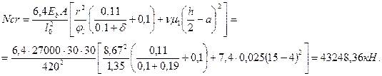 1. Nmax =3983,71 кН, в том числе от длительных нагрузок Nl =2355,56 кН 2. M=18,25 кНм, в том числе от длительных нагрузок М=10,13 кНм, maxM=47,6 кНм, в том числе Мi =18,7 кНм и соответствующее загружению 1+2 значение N=3983,71-443,23/2=3762,1 кН, в том числе Ni =2355,56-130,01/2=2290,56 кН. Рабочая высота сечения h0 =h-а=30-4=26 см, ширина b=30 см, эксцентриситет силы е0 =4760/3762,1=1,27 см Случайный эксцентриситет e0 =h/30=30/30=1 см или e0 =lcol/600=420/600=0,7 см , но не менее 1см. Поскольку эксцентриситет силы e0 =1,27 см больше случайного эксцентриситета e0 =1 см, то для расчета статически неопределимой системы принимаем e0 =1,27 см. Найдем значение моментов в сечении относительно оси, проходящей через центр тяжести наименее сжатой (растянутой) арматуры. При длительной нагрузке М1 l =Мl +Nl (h/2-a)=18,7+2290,56(0,30/2-0,04)=270,66 кНм; при полной нагрузке М1 =47,6+3762,1·0,11=461,43 кНм. l0 /r=420/8,67=48,44>14=>следует учитывать влияние прогиба колонны. где r=0,289h=8,67 см-радиус ядра сечения. Расчетная длина колонн многоэтажных зданий при жестком соединении ригелей с колоннами в сборных перекрытиях принимается равной высоте этажа l0 =l=4,2 м. Для тяжелого бетона φl =1+М1 l /М1 =1+270,66/461,43=1,59. Значение δ= e0 /h=1,27/30=0,042< δmin =0,5-0,01l0 /h-0,01Rb =0,5-0,01·420/30-0,01·17=0,19; принимаем δ=0,19. Отношение модулей упругости ν=Es /Eb =200000/27000=7,4. Задаемся коэффициентом армирования
