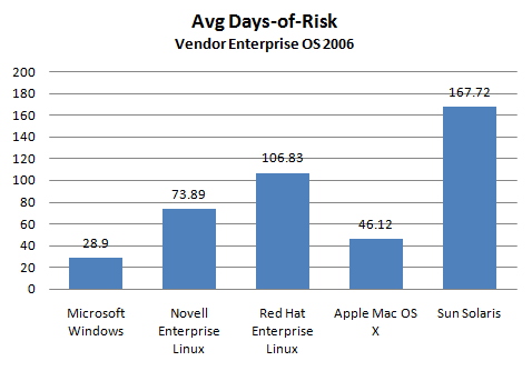 Итак, модель мы построили, теперь с ее помощи проведем исследование. Оценка уровня эксплуатационной безопасности современных универсальных ОС. Как ранее отмечалось, основными параметрами, используемыми для оценки эксплуатационной безопасности системных средств, являются интенсивности отказов защиты (обнаружения уязвимостей) и восстановления защиты (устранения уязвимостей). Для определения значений данных параметров обратимся к двум любопытным исследованиям. Первое исследование, которое здесь будет приведено: «"Критические дни": Linux, Mac OS X, Solaris and Windows» опубликовано на сайте www.securitylab.ru 19 июня 2007 года. Джефф Джонс провел очередное исследование на тему того, как долго компании закрывают найденные дыры в своем ПО. Рассматривались следующие коммерческие операционные системы: