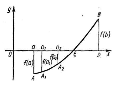 и Метод проб . Пусть дано уравнение f (x ) = 0 [f (x ) – непрерывная функция] и корень ε отделен на отрезке [а , b ], т. е. f (а ) ∙ f (b ) < 0, причем b – а > ε. Требуется найти значение корня ξ с точностью до ε (рис. 2.1)