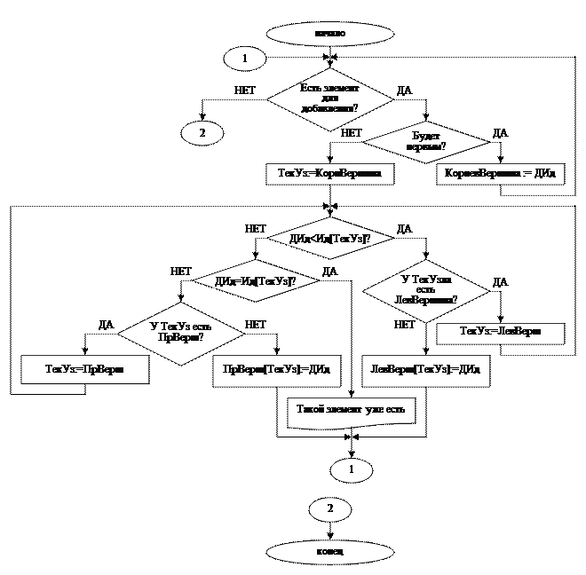 Данный метод организует таблицу идентификаторов в форме бинарного дерева. Каждый узел этого дерева представляет собой элемент таблицы идентификаторов, причем корневым узлом становится первый элемент, встреченный компилятором во входном тексте. Дерево называется бинарным, так как каждая вершина в нем может иметь не более двух вершин (для определенности используют понятия «правая» и «левая» ветви). Схема алгоритма добавления идентификатора приведена на рис. 1.1.