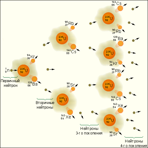 В настоящее время известны около 100 различных изотопов с массовыми числами примерно от 90 до 145, возникающих при делении этого ядра. Обратите внимание, что в результате деления ядра, инициированного нейтроном, возникают новые нейтроны, способные вызвать реакции деления других ядер. Продуктами деления ядер урана-235 могут быть и другие изотопы бария, ксенона, стронция, рубидия и т. д. Кинетическая энергия, выделяющаяся при делении одного ядра урана, огромна – порядка 200 МэВ. Оценку выделяющей при делении ядра энергии можно сделать с помощью удельной энергии связи нуклонов в ядре. Удельная энергия связи нуклонов в ядрах с массовым числом A ≈ 240 порядка 7,6 МэВ/нуклон, в то время как в ядрах с массовыми числами A = 90–145 удельная энергия примерно равна 8,5 МэВ/нуклон. Следовательно, при делении ядра урана освобождается энергия порядка 0,9 МэВ/нуклон или приблизительно 210 МэВ на один атом урана. При полном делении всех ядер, содержащихся в 1 г урана, выделяется такая же энергия, как и при сгорании 3 т угля или 2,5 т нефти. Продукты деления ядра урана нестабильны, так как в них содержится значительное избыточное число нейтронов. Действительно, отношение N / Z для наиболее тяжелых ядер порядка 1,6, для ядер с массовыми числами от 90 до 145 это отношение порядка 1,3–1,4. Поэтому ядра-осколки испытывают серию последовательных β– -распадов, в результате которых число протонов в ядре увеличивается, а число нейтронов уменьшается до тех пор, пока не образуется стабильное ядро. При делении ядра урана-235, которое вызвано столкновением с нейтроном, освобождается 2 или 3 нейтрона. При благоприятных условиях эти нейтроны могут попасть в другие ядра урана и вызвать их деление. На этом этапе появятся уже от 4 до 9 нейтронов, способных вызвать новые распады ядер урана и т. д. Такой лавинообразный процесс называется цепной реакцией. Схема развития цепной реакции деления ядер урана представлена на рис. 1.