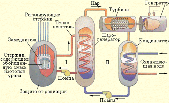 был больше единицы. Другими словами, в каждом последующем поколении нейтронов должно быть больше, чем в предыдущем. Коэффициент размножения определяется не только числом нейтронов, образующихся в каждом элементарном акте, но и условиями, в которых протекает реакция – часть нейтронов может поглощаться другими ядрами или выходить из зоны реакции. Нейтроны, освободившиеся при делении ядер урана-235, способны вызвать деление лишь ядер этого же урана, на долю которого в природном уране приходится всего лишь 0,7 %. Такая концентрация оказывается недостаточной для начала цепной реакции. Изотоп Цепная реакция в уране с повышенным содержанием урана-235 может развиваться только тогда, когда масса урана превосходит так называемую критическую массу. В небольших кусках урана большинство нейтронов, не попав ни в одно ядро, вылетают наружу. Для чистого урана-235 критическая масса составляет около 50 кг. Критическую массу урана можно во много раз уменьшить, если использовать так называемые замедлители нейтронов. Дело в том, что нейтроны, рождающиеся при распаде ядер урана, имеют слишком большие скорости, а вероятность захвата медленных нейтронов ядрами урана-235 в сотни раз больше, чем быстрых. Наилучшим замедлителем нейтронов является тяжелая вода D2 O. Обычная вода при взаимодействии с нейтронами сама превращается в тяжелую воду. Хорошим замедлителем является также графит, ядра которого не поглощают нейтронов. При упругом взаимодействии с ядрами дейтерия или углерода нейтроны замедляются до тепловых скоростей. Применение замедлителей нейтронов и специальной оболочки из бериллия, которая отражает нейтроны, позволяет снизить критическую массу до 250 г. В атомных бомбах цепная неуправляемая ядерная реакция возникает при быстром соединении двух кусков урана-235, каждый из которых имеет массу несколько ниже критической. Устройство, в котором поддерживается управляемая реакция деления ядер, называется ядерным (или атомным ) реактором . Схема ядерного реактора на медленных нейтронах приведена на рис. 2. Ядерная реакция протекает в активной зоне реактора, которая заполнена замедлителем и пронизана стержнями, содержащими обогащенную смесь изотопов урана с повышенным содержанием урана-235 (до 3 %). В активную зону вводятся регулирующие стержни, содержащие кадмий или бор, которые интенсивно поглощают нейтроны. Введение стержней в активную зону позволяет управлять скоростью цепной реакции. Активная зона охлаждается с помощью прокачиваемого теплоносителя, в качестве которого может применяться вода или металл с низкой температурой плавления (например, натрий, имеющий температуру плавления 98 °C). В парогенераторе теплоноситель передает тепловую энергию воде, превращая ее в пар высокого давления. Пар направляется в турбину, соединенную с электрогенератором. Из турбины пар поступает в конденсатор. Во избежание утечки радиации контуры теплоносителя I и парогенератора II работают по замкнутым циклам. Турбина атомной электростанции является тепловой машиной, определяющей в соответствии со вторым законом термодинамики общую эффективность станции. У современных атомных электростанций коэффициент полезного действия приблизительно равен 1/3. Следовательно, для производства 1000 МВт электрической мощности тепловая мощность реактора должна достигать 300