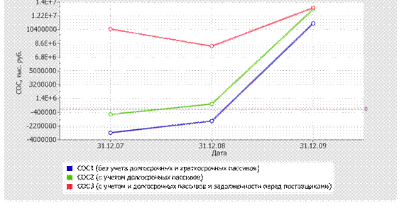 *Излишек (недостаток) СОС рассчитывается как разница между собственными оборотными средствами и величиной запасов и затрат. Для наглядности представим имеющийся цифровой материал в виде диаграммы (см. рисунок 2.3).