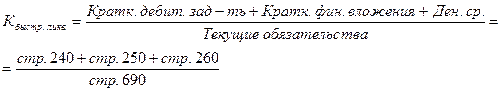 Коэффициент абсолютной ликвидности показывает отношение стоимости ликвидных активов к сумме текущих обязательств. По сравнению с коэффициентом текущей ликвидности признается показателем, более точно отражающим способность компании оплатить краткосрочные обязательства, поскольку в этом случае не предполагается получение выручки от реализации запасов. Удовлетворительному финансовому положению предприятия обычно отвечают значения этого коэффициента, превышающие 0,8 – 1,0 Коэффициент быстрой ликвидности рассчитывается по формуле (2.5):