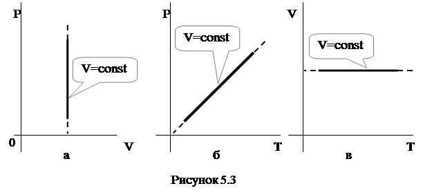 „P‑T” або „V‑T”, - називається ізобарою . Найбільш інформативним є графік рис. 5.2в, він свідчить про те, що об’єм ідеального газу за температури, що прагне до абсолютного нуля, також прагне до нуля – за припущенням ідеальний газ складається з матеріальних точок. Реальні гази не можуть мати нульового об’єму, за досить низьких температур газ перестане відповідати умовам ідеального газу. Ізохоричний (ізохорний) процес підкоряється закону Шарля : для постійної маси ідеального газу за постійного об’єму тиск зростає прямо пропорційно до зростання температури: