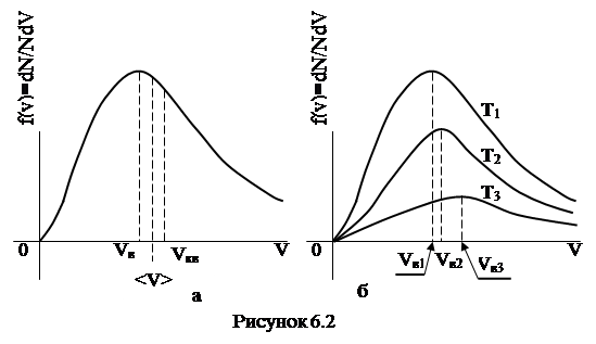 Якщо температура газу зростає до нескінченості функція розподілу співпаде з віссю швидкостей, тобто всі швидкості від нуля до нескінчено великої будуть рівно представлені. Навпаки, коли температура газу прагнутиме до абсолютного нуля, швидкості всіх молекул стануть нульовими. Найбільш ймовірною швидкістю є швидкість V в , що відповідає максимуму функції (6.13) (див. рис. 6.2). Дослідження на максимум функції (6.13) дає результат: