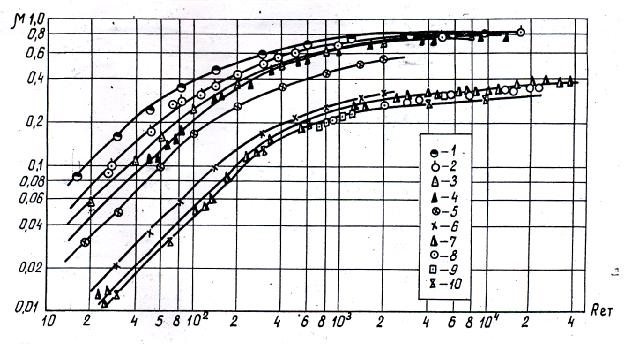 Рис.1. Коэффициент расхода патрубков сливных приборов железнодорожных цистерн и средств герметизации слива:1 – универсальный сливной прибор по данным З.И.Геллера; 2 – универсальный сливной прибор по данным ВНИИСПТнефть;3 – сливной прибор Утешинского по даннымЗ.И.Геллера;4 – сливной прибор Утешинского по данным ВНИИСПТнефть; 5 – универсальный сливной прибор по данным В.М. Свистова; 6 – сливной прибор Утешинского по данным В.М. Свистова; 7 – установкаАСН-7Б; 8 – установка УСН - 175М; 9 – установкаУСН-175 с действующим монитором; 10 – установкаСЛ-9. Находим время полного слива цистерны: