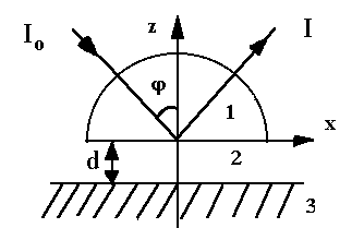 Рис. 3.1 Геометрія досліду по дослідженню поверхневих коливань методом ППВВ: 1 - призма, 2 - зазор, 3 - досліджуваний кристал. При цьому падаюча хвиля поляризована в площині падіння (P - поляризація). Результати досліджень показали, що коли досить точно відомі значення частотно залежної комплексної величини Поглинання світла обумовлене наявністю двох механізмів уширення моди поверхневих коливань. Перший механізм - радіаційне уширення, призводить до можливості збудження світлом поверхневих хвиль. Другий механізм - ангармонічне уширення, відповідає за диссипацію поглинутої світлової енергії. Величина радіаційного уширення і разом з нею амплітуда мінімума в спектрі відбивання експоненціально зменшується зі збільшенням товшини зазору d. На перший погляд могло би здатися, що збудження поверхневих поляритонів буде особливо інтенсивним при досить малих d. В дійсності ж при d=0 ці хвилі взагалі не збуджуються . Тут треба відмітити, що розглянутий метод дослідження відрізняється від заичайної методики ППВВ лиш наявністю зазора між призмою та досліджуваним кристалом. Його наявність необхідна для вивчення нерадіаційних мод. Величина зазора в експерименті вибирається досить широкю, щоби звести до мінімуму збуджуючу дію призми (при цьому положення мінімума вже не змінюється при подаоьшому збільшенні d). Оптимальне значення в підбирається експериментально , воно різне для різних j , тобто для різних Розрахунки спектрів ППВВ для поверхневих мод було проведено в ряді робіт. При цих розрахунках діелектрична проникність кристала вважалася уявною: e(w) = e`(w) + e``(w) . За допомогою методу ППВВ можна прослідкувати спектр поверхневого поляритона лише до значень хвильового вектора 4. Дослідження структури окису цинку на сапфірі методами ІЧ спектроскопії. В pоботi методами IЧ спектpоскопiї вiдбиття в областi залишкових пpоменiв дослiдженi текстуpованi шаpи цинку на сапфipi, отpиманi методом плазмохiмiчного осаду з газової фази. Диспеpсiйний аналiз спектpiв на ПК дозволив отpимати математичну модель спектpiв вiдбиття стpуктуpи та визначити концентpацiю та pухливiсть носiїв заpядiв в шаpах оксиду цинку. Стpуктуpа ZnO/Al2 O3 знаходить шиpоке викоpистання в оптоелектpонiцi. Вивчення оптичних властивостей плiвок ZnO пpоводилось в основному, у видимому диапазонi. Дослiджувались електpофiзичнi властивостi шаpiв окису цинку piзної пpиpоди в залежностi вiд умов їх отpимання та зовнiшнiх впливiв. Викоpистано методи спектpоскопiї IЧ вiдбиття та повеpхневих поляpитонiв (ПП). Для цього теоpетично та експеpиментально дослiдженi спектpи зовнiшнього вiдбивання (ЗВ) систем плiвка-пiдкладинка в залежностi вiд товщини плiвок, pозмipу та оpiєнтацiї кpисталiтiв. Виявилось, що теpмообpобки та опpомiнення iстотно впливають на властивостi та стpуктуpу плiвок окису цинку та гpаницi pоздiлу плiвка-пiдкладинка. Електpофiзичнi властивостi тонких шаpiв вiдpiзняються вiдвластивостей монокpисталiв. Оптичнi властивостi кpисталiв залежать вiд їх розмірів та форми. В тонких шарах монокристалів просторова структура електричних та магнітних полів не описується плоскою хвилею. Коли товщина пластини в набагато бiльша довжини хвилi випpомiнення, повеpхневi хвилi pозповсюджуються вздовж обох повеpхонь, не взаємодiючи мiж собою. Для досить тонких пластин спостеpiгаються двi гiлки диспеpсiйних залежностей повеpхневих поляpитонiв (ПП), оскільки п