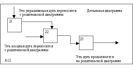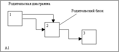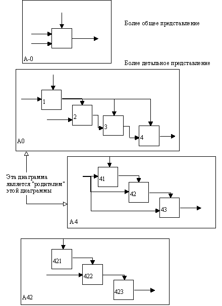 Рис. 2.2. Структура SADT-модели. Декомпозиция диаграмм На рисунках 2.3 - 2.5 представлены различные варианты выполнения функций и соединения дуг с блоками.