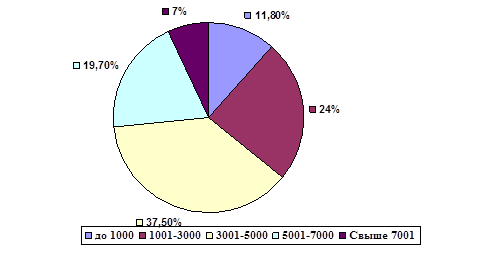 Примечание: Выборочная совокупность, как и генеральная, в сумме мужчин и женщин в итоге составляют 100%. Сумма по строкам генеральной совокупности у мужчин и женщин не может сходиться, так как не учтена группа респондентов в возрасте от 0 до 15 лет. Из таблицы 1.1 видно, что данные выборочной совокупности почти полностью отражают данные генеральной совокупности. Так, доля мужчин «от 15 до 18 лет» по выборочной совокупности составляет 3,6%, по генеральной — 3,0%. Значения близки, что подтверждает достоверность результатов проведенного исследования и дает возможность применить полученные данные ко всему населению г. Ростове-на-Дону. В анкетировании принимали участие 314 человек в возрасте 15 лет и старше. Объем выборки, соответствующей генеральной совокупности населения г. Ростова-на-Дону [3], составил 304 человека. (Объем выборки был сокращен на 10 человек для приближения к генеральной совокупности.) Этого достаточно для получения наглядной картины рынка косметических товаров и его потенциальных покупателей. Респонденты были представлены в различных возрастных категориях, респонденты моложе 15 лет не были включены в маркетинговые исследования, так как в этом возрасте, как правило, все косметические товары им приобретают родители. Возраст 15—18 лет уже считается трудоспособным, и подростки могут сами принимать решение о покупке тех или иных косметических товаров. Эта целевая группа необходима также для изучения подростковых проблем с кожей, а также отношения подростков к потребительским свойствам применяемых косметических товаров. Опросы потребителей проводились в специализированных магазинах, («Иль де Боте», «Л,Этуаль», «Ив Роше»); супермаркетах («Магнит», «Солнечный круг», «Перекресток»); аптеках, где в достаточном ассортименте представлены косметические средства по уходу за кожей разных торговых марок. Распределение респондентов по роду занятий и уровню дохода приводится на рисунке 1.1 (а, б). а) По уровню дохода, руб.
