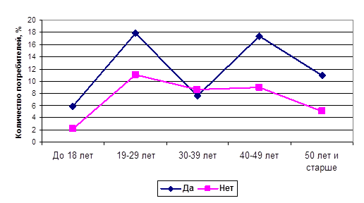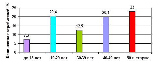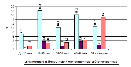 Рис. 1.4 Соотношение использования импортных и отечественных ТМ различными возрастными категориями
