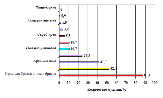 Рис. 1.2 Структура потребителей косметических средств Из рисунка 1.2 следует, что косметическими средствами по уходу за кожей пользуются чаще замужние женщины (26,7%) и женатые мужчины (18,5%). Это характеризуется их желанием чувствовать себя уверенно и сохранить натуральную красоту. Наибольшую долю пользователей занимают люди 50 лет и старше (23%), 19—29 лет (20,4%) и 40—49 лет (20,1%), наименьшую — до 18 лет (7,2%) и 30—39 лет (12,5%). На следующем этапе были выявлены предпочтения мужчин и женщин в предложенном перечне косметических средств. Исследования показали (см. рис. 1.З а), что у женщин наибольшая доля в ассортименте приходится на крем для рук (90,7%) и крем для лица (88%), средняя - на крем для ног (53,3%), скраб-крем (48,7%). У мужчин (рис. 1.3 б) наибольшую долю занимают крема для бритья и после бритья (87,4%), а затем распределение позиций практически одинаково: крем для рук - 52,4%, крем для лица - 41,7%. Дополнительно к предложенному списку косметических средств были названы: крем для глаз и век (0,7%) и пена для бритья (0,9%). Можно сделать вывод, что в целом наибольшим спросом пользуются крем для рук и крем для лица. а) Женщины