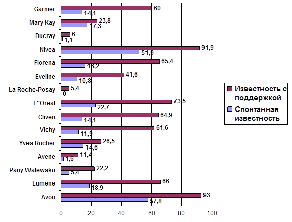 Рис. 1.5 Соотношение косметических средств импортных и отечественных ТМ Для определения уровня «известности с поддержкой» потребителям было предложено отметить все известные им марки из предложенного списка (см. рис.1.6). Марки Avon (93%) и Nivea (91,9%), занимающие первые места при определении «спонтанной известности», повторились и в тесте на определение «известности с поддержкой». Показатели известности относительно невысок у таких достаточно распространенных марок, как PaniWalewska (22,2%), YvesRoche (26,5%), MaryKay (23,8%). Марки, которые пpи определении «спонтанной известности» получили наименьший процент, при определении «известности с поддержкой» также получили самые низкие показатели: Avene(1,6% спонтанная известность — 11,4% известность с поддержкой), LaRoche-Posay(0—5,4%), Ducray (1,1—6%). Видимо, в силу того что они довольно дорогие, продаютcя только в аптеках и совсем не рекламируемы.