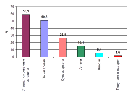 Рис. 1.6 Рейтинг популярности импортных ТМ Марки: L'Oreal, Garnier, Lumene, GivenVichy, Florena, Eveline имеют более высокий процент «известности с поддержкой», чем «спонтанной известности». Во многом это объясняется тем, что эти марки уже давно присутствуют на рынке и легко вспоминаемы (при наличии их в списке), но в последнее время уступили позиции другим, более активно рекламируемым маркам. Далее респондентам было предложено оценить важность каждого из 12 потребительских показателей по следующим параметрам: очень важно (4 балла), относительно важно (3 балла), неважно (2 балла) и абсолютно неважно (1 балл). Усредненные данные, представленные на лепестковой диаграмме (см. рис. 1.7), показывают, что очень важными потребители считают показатели, определяемые составом эффективность — 3,9 балла, польза — 3,9 балла, качество товара — 3,8 балла, безопасность — 3,6 балла. Относительно важными для них являются следующие показатели натуральность — 3,4 балла, состав — 3,3 балла, одним из наиболее важных фактор определяющих спрос, является цена, потребители оценили ее также относительно в. ной (3,3 балла). Степень значимости рекламы косметических средств в целом оценена потребителями ниже всех остальных показателей (хотя зачастую именно она подталкивает нас к совершению импульсивных покупок) — 2,1 балла. Столь низкую оценку можно объяснить общим негативным отношением населения к рекламе, зачастую недобросовестной, навязчивой и агрессивной, в средствах массовой информации. Эксплутационные показатели, такие как удобство пользования и внешний вид, упаковка, оно не невысоко (3 балла, 2,5 балла соответственно). Известность торговой марки потребители считают недостаточно важным показателем — 2,8 балла. Новизна товара (2,2 балла) также является не особо важным показателем для современных потребителей. Были установлены наиболее популярные места приобретения косметических средств. Из диаграммы (см. рис.1.8) видно, что большинство потребителей приобретают косметические средства в специализированных магазинах (58,9%). Значительная часть населения приобретает косметические средства по каталогам у торговых агентов (50,8%), в супермаркетах — 26,5%, в аптеках незначительная часть населения — 15,1%. Некоторые приобретают косметические средства в киосках (5,4%), а кому-то их просто дарят (1,6%).
