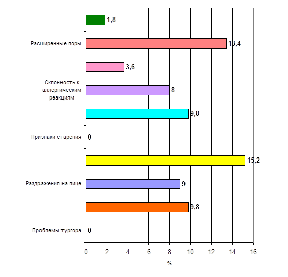 Рис. 1.14 Проблемы с кожей возрастной категории - 19-29 лет Все данные приведенные в этих диаграммах, можно использовать для разработки целых комплексов по уходу за кожей, которые будут связаны не просто с типом кожи (сухая, жирная, комбинированная), но и с возвратными категориями потребителей. Например, в категории 30-39 лет мы видим значительные изменения данных по сравнению с категориями до 18 лет и 19-29 лет. Здесь преобладают признаки: сухость кожи, раздражения на лице.