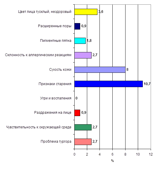 Рис. 1.11 Частота ухода за кожей лица и рук Ответы на вопросы, касающиеся проблем с кожей, проанализированы с учетом возраста респондентов (см. рис. 1.12). Из данных анкетирования можно сделать вывод по поводу наличия каких-либо проблем с кожей у населения. Далее в процентном соотношении приведены все полученные результаты. Они помогут производителям косметических средств по уходу за кожей лучше разобраться в проблемах покупателей их продукции. Пересмотреть свое позиционирование на рынке и направленность на определенную целевую аудиторию.