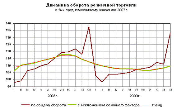 В предшествующий кризису период прирост оборота розничной торговли пищевыми продуктами, включая напитки и табачные изделия, составил в среднем за год 11-13 % . В 2009 г. объемы продажи пищевых продуктов, включая напитки, и табачных изделий (в сопоставимых ценах) были ниже уровня 2008 года. Наибольшее снижение было зафиксировано в сентябре 2009 г. (на 5,1 % по сравнению с сентябрем 2008 г.). Сокращение объемов продажи коснулось в большей степени тех продуктов питания, на которые значительно возросли потребительские цены. В 2009 г. на рынке алкогольной продукциитакженаблюдалась тенденция снижения покупательского спроса: продажа коньяка возросла на 3,5 %, шампанских и игристых вин - на 1,4 %, виноградных и плодовых вин - сократилась на 0,4 %, водки и ликероводочных изделий уменьшилась на 4,6 %, продажа пива сократилась на 4,1 %. До 2008 г. высокий прирост оборота розничной торговли во многом обеспечивался за счет поступлений импортных товаров, что привело к увеличению их доли в структуре товарных ресурсов розничной торговли. С 2008 года на фоне мирового экономического кризиса и применении мер таможенно-тарифного регулирования доля импортных товаров начала снижаться. Импорт потребительских товаров в 2009 году сократился по сравнению с 2008 г. на 25,3 %, в результате доля импорта в объеме товарных ресурсов розничной торговли сократилась до 4 1 % против 44 % в 2008 году. На 2009 г. состояние розничной торговли характеризовалось следующими итогами: - в формировании валового внутреннего продукта Российской Федерации доля оптовой и розничной торговли (включая ремонт автотранспортных средств, мотоциклов, бытовых изделий и предметов личного пользования) составила в основных ценах (включая субсидии на продукты, без налогов на них) 19,7 % (в 2008 г. - 20,9 %); - индекс физического объема оборота розничной торговли в целом по Российской Федерации опустился ниже стопроцентной отметки и составил 95,1 %. Сокращение оборота по сравнению с 2008 г. наблюдалось в течение всех месяцев 2009 г. (кроме января), достигнув своего пика в сентябре (- 9,5 % по сравнению с соответствующим месяцем 2008 г.); - на фоне снижения покупательского спроса предпочтения населения во многом были отданы рыночной торговле. При сокращении по сравнению с 2008 г. объемов продажи товаров торгующими организациями (включая индивидуальных предпринимателей вне рынка) на 5,3 %, объемы продажи на рынках упали лишь на 2,3 % в основном за счет уменьшения покупок непродовольственных товаров, продажа пищевых продуктов на рынках сохранились практически на том же уровне (99,4 %); - несмотря на отрицательную в 2009 г. динамику оборота розничной торговли в целом по всем хозяйствующим субъектам, торговые сетевые структуры удерживали торговый оборот на относительно постоянном уровне (102,4 % к уровню 2008 г. в сопоставимых ценах). Доля продажи через сетевые форматы торговли в общем обороте розничной торговли составила 14,6 % против 13,6 % в 2008 году. В обороте торгующих организаций эта доля составила 24,2 % (в 2008 г. - 22,0 %); - прочное место в торговле по-прежнему занимает малый бизнес. Субъекты малого предпринимательства формировали в 2009 г. более половины всего оборота розничной торговли; - соотношение пищевых продуктов, включая напитки и табачные изделия, и непродовольственных товаров до кризиса 2008 г. показывало динамику увеличения доли последних. В 2009 г. в структуре оборота роз