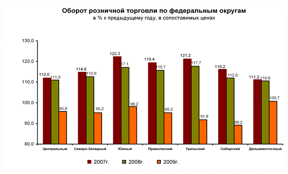 Процессы, происходящие в целом в сфере розничной торговли, характерны для субъектов Российской Федерации, но в каждом субъекте имеется своя специфика. Оборот розничной торговли в 2009 г. по сравнению с 2008г. уменьшился во всех федеральных округах, кроме Дальневосточного федерального округа (Рисунок 2.2). Рис. 2.2 Оборот розничной торговли по федеральным округам за 2007- 2009 гг.