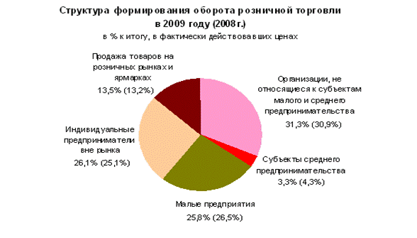 В 2009 г. ниже среднероссийского уровня индекс физического объема оборота розничной торговли был в тридцати трех регионах из восьмидесяти трех, в том числе в Республике Коми (88 %), Алтайском крае (82,5 %), Кемеровской области (77,8 %), Ростовской (84,7 %), Тюменской (86,8 %), Вологодской (89,4 %), Иркутской (89,5 %) и Нижегородской (90 %) областях. Уменьшение оборота в этих регионах в основном обусловлено снижением покупательского спроса на непродовольственные товары. В то же время, в шести субъектах Российской Федерации наблюдался незначительный (до одного процента) прирост оборота розничной торговли, в восьми регионах прирост составлял 1-3 %, в стольких же субъектах - свыше 3 %. В последнюю группу вошли Хабаровский край (прирост составил 3,6 %), Чукотский и Ненецкий автономные округа (3,2 % и 7,6 % соответственно), регионы Южного федерального округа: республики Северная Осетия - Алания (3,7 %), Калмыкия (4,3 %), Чеченская Республика (9,3 %), республики Дагестан (10,6 %) и Адыгея (11,7 %). В структуре оборота розничной торговли на пять субъектов Российской Федерации: Москву, Санкт-Петербург, Московскую, Самарскую и Тюменскую области - приходилось 33,9 % всего оборота, в том числе на Москву - 17,3 %, Санкт-Петербург - 4,2 %. В 2009 г. на фоне снижения покупательского спроса наблюдалась переориентация населения с магазинов на рынки. При сокращении по сравнению с 2008 г. объемов продажи товаров торгующими организациями (включая индивидуальных предпринимателей вне рынка) на 5,3 %, объемы продажи на рынках упали лишь на 2,3 % в основном за счет уменьшения покупок непродовольственных товаров, продажа пищевых продуктов на рынках сохранились практически на том же уровне (99,4 %). Если до кризиса доля рынков в общем объеме оборота розничной торговли имела тенденцию к сокращению, то в 2009 г. она несколько возросла и составила 13,5 % против 13,2 % в 2008 году. За прошлый год доля рынков выросла в тридцати трех субъектах Российской Федерации, особенно существенно (на два-пять процентных пунктов) в Москве, Республике Дагестан, Курской, Вологодской, Томской, Тюменской областях. В то же время, в 2009 г. почти в каждом втором субъекте Российской Федерации доля рынков и ярмарок в общем объеме оборота розничной торговли не превышала 10 %. Прочное место в торговле занимает малый бизнес. Субъекты малого предпринимательства формировали в 2009 г. более половины всего оборота розничной торговли. В Республиках Бурятия, Калмыкия, Саха (Якутия), Чеченской Республике, Забайкальском крае, Архангельской, Астраханской, Курганской, Сахалинской, Челябинской областях, Еврейской автономной области индивидуальные предприниматели вне рынка в 2009 г. формировали более половины оборота розничной торговли, в то же время в Москве - 4,5 %, Санкт-Петербурге - 3,8 %. Все вышеперечисленные данные можно преобразовать в единую структуру оборота розничной торговли (Рисунок 2.3). Рис. 2.3 Структура формирования оборота розничной торговли в 2008-2009 гг.