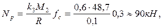 где G = 20 кН — вес стола и вкладышей ротора У7-560-6; Np — осевое усилие, создаваемое трением ведущей трубы о вкладыши, Н: