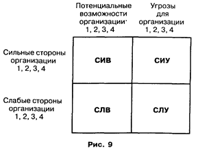 В некоторых случаях требуется проведение более сложных видов статистического анализа: • однофакторный или двухфакторный анализ (определяется мера влияния одного или двух факторов на конечный результат, например возраста покупателей (или пола и возраста) на объемы продаж); • корреляционный анализ (выявление статистической взаимозависимости двух или более переменных, например тех или иных условий труда и производительности, технологических режимов производства и затрат и т.д.); • кластерного анализа (отнесение или группировка тех или иных объектов (фирм, товаров, клиентов) к одному классу или кластеру по их похожести друг на друга). Стратегическое управление предполагает анализ внешней и внутренней среды организации. Анализ внешней среды соответственно включает в себя анализ макроокружения и анализ непосредственного окружения. Анализ макроокружения включает в себя: • анализ влияния экономических факторов (инфляция, курсы валют, уровень безработицы, процентные ставки, ставки налогов, показатели производительности труда и др.); • анализ правового регулирования; • анализ политических факторов; • анализ социальных факторов (рост и возраст населения, уровень образования, уровень жизни, верования, обычаи, традиции, жизненные ценности); • анализ научного и технологического развития. Анализ непосредственного окружения предполагает: • анализ покупателей (составляется профиль покупателей); • анализ поставщиков; • анализ конкурентов; • анализ рынка рабочей силы. Анализ внутренней среды предусматривает: • анализ кадрового состава; • анализ организационных процессов (коммуникации, нормы и правила, процедуры, соотношение прав и ответственности, иерархия подчинения и др.); • анализ маркетинговых процессов (выбор продукта, стратегия ценообразования, стратегия продвижения товара, выбор рынков сбыта, систем сбыта товара, связи с общественностью и др.); • анализ финансового состояния. В анализе внешней и внутренней среды могут быть использованы и другие инструменты: • матрица SWOT; • матрица возможностей; • матрица угроз; • профиль среды. Матрица SWOT (от англ. слов: сила, слабость, возможности, угрозы) имеет следующую структуру (рис.9).