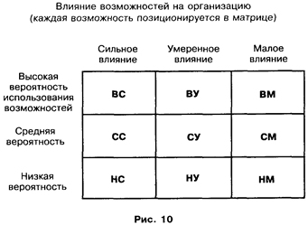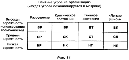 Если возможность попала на поля ВС, ВУ, СС, обязательно используйте ее. Возможности, попадающие на поля СМ, НУ и НМ, не заслуживают внимания организации. Если возможности попали на остальные поля, руководство должно принять позитивное решение об их использовании, если организация имеет достаточный объем ресурсов. Матрица угроз имеет следующую структуру (рис.11).