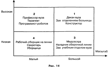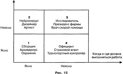 Масштабность характеризуется количеством задач или операций, которые работник должен выполнить. Сложность работы отражает степень самостоятельности в принятии решений и степень владения процессом труда. Виды деятельности подразделяются на: • узкоспециализированные (с низким масштабом работы); • широкоспециализированные (с высоким масштабом работы). Определение масштаба и сложности процесса труда позволяет в дальнейшем совершенствовать систему оплаты и мотивированности труда (приоритеты в оплате должны быть 1—2—3—4, см. рис.14). Выявление отношений между работниками в процессе труда позволяет в дальнейшем сформировать оптимальную структуру организации. Большое значение имеет определение менеджментом восприятия процесса труда персоналом, а именно: • разнообразие видов деятельности; • самостоятельность в принятии решений (автономность); • уровень доведения работы до конца; • уровень информированности работника о конечных результатах труда; • удовлетворенность масштабом взаимодействия с другими работниками; • удовлетворенность неформальными связями; • удовлетворенность степенью контроля за работой. Очень важно выявить позицию работника в матрице «как-когда-где» и взаимозависимость работы (рис.15). Сложность работы