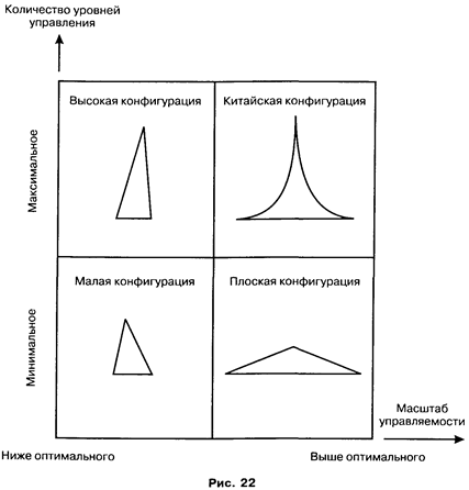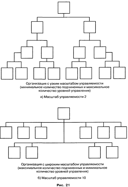 Многие специалисты в качестве ориентира для определения масштаба управляемости рекомендуют некие усредненные величины. Считается, что для высшего звена управления число подчиненных у одного руководителя должно подчиняться «закону 7 плюс-минус 2», т.е. не менее пяти и не более 9 (в среднем 7). В целом организации могут иметь узкий и широкий масштабы управляемости (см. рис. 21а, 216). Соотношение уровней управления (иерархии) и масштаба управляемости можно выразить матрицей (см. рис.22). Каждая организация должна выбрать зону соотношения уровней и масштаба управления, которая, как правило, связана со специализацией и разделением трудового (технологического) процесса на отдельные операции. СПЕЦИАЛИЗАЦИЯ И РАЗДЕЛЕНИЕ ТРУДА. Разделение труда идет по двум направлениям: • горизонтальному (например, последовательно «снабжение—планирование—производство—сбыт»); • вертикальному (по уровням иерархии организации). Сверхспециализация может привести к следующим негативным последствиям: • затрудняет видение общей цели организации; • приводит к возрастанию роли координационных механизмов и бюрократического аппарата; • порождает различия микрокультур труда. Одновременно специализация и разделение труда способствуют повышению производительности труда. КОММУНИКАЦИИ И КООРДИНАЦИЯ. В соответствии со структурой, отношениями и культурной средой образуются и коммуникации-связи в организации: • рабочие горизонтальные (на одном уровне иерархии); • рабочие вертикальные (с одного уровня иерархии на другой); • линейные (реализующие отношения «начальник—подчиненные»); • функциональные (штабные), несущие совещательные или рекомендательные функции;