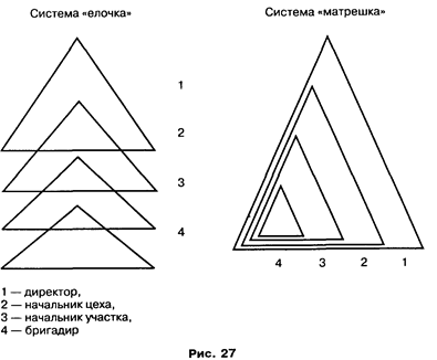 Для менеджера очень важно знать, в какой зоне находится он сам и его собеседник и регулировать свое поведение в зависимости от ситуации. Имеющие большое значение невербальные коммуникации. Они характеризуются: • движениями и пластикой тела (жесты, мимика, позы и т.д.); • личными физическими данными (строение тела, вес, рост, цвет волос, глаз, запах тела, мускулатура); • речью (дикция, тембр, мощность ударения и др.); • манерой поведения; • внешней средой (дизайн помещения, мебель, чистота, опрятность, освещенность, шум); • организационной культурой (опоздания, ранний приход, склонность заставлять себя ждать и т.д.). РАСПРЕДЕЛЕНИЕ ПРАВ И ОТВЕТСТВЕННОСТИ. Возможны два варианта распределения прав и ответственности система «елочка» и система «матрешка» (рис.27).