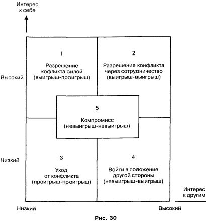 Если конфликтная ситуация находится под контролем руководства, то такие конфликты называют функциональными. Они оказывают положительное воздействие на эффективность организации и полезны для нее (диапазон АВ). Функциональные конфликты могут возникать на совещаниях, советах, в деловой полемике и т.д. Участвующие в них стороны обычно контролируют себя и ситуацию. Если ситуация выходит из-под контроля руководства, конфликт принимает дисфункциональный характер. Дисфункциональный конфликт приводит к снижению личной удовлетворенности сотрудников, эффективности группового сотрудничества, ведет к враждебности в отношениях, к несправедливости в распределении ресурсов, вынуждает поступать против своей воли в пользу одной из сторон. Выделяют следующие виды конфликтов: • внутриличностные (связанные с противоречиями между «хочу», «могу» и «надо» в человеке); • межличностные (на профессионально-производственной, социальной и эмоциональной почве); • внутригрупповые (из-за изменения баланса сил в группе, например, в результате смены руководства, появления неформального лидера, повышения нагрузки в работе и т.д.); • типа «личность—группа»; • типа «группа—группа»; • внутриорганизационные (на почве неправильного распределения властных прав, полномочий и ответственности между уровнями управления — вертикальные; на одном уровне — горизонтальные; между линейными и функциональными подразделениями — линейно-функциональные конфликты); • ролевые конфликты (из-за неопределенности и конфликта ролей, предоставляемых работнику). Неопределенность ролей имеет место в тех случаях, когда сотрудник не имеет четких целей, заранее определенных для выполнения рабочей задачи ресурсов, его полномочия и ответственность весьма расплывчаты. В случаях, когда рабочее задание сотрудника предполагает исполнения им новой, не подкрепляемой его полномочиями и его властью роли, имеет место ролевой конфликт, как правило, приводящий к стрессу. Причины конфликтов: • неправильное или несправедливое распределение ресурсов; • различие целей (высокая эмерджентность и дифференциация подразделений); • плохая структуризация (неясные, нечетко поставленные задачи); • различные представления и ценности членов коллектива и групп; • различия в манерах и стилях поведения и руководства; • возрастные проблемы («проблема отцов и детей»); • половые проблемы; • этнические и межнациональные проблемы; • проблемы различных уровней образования и культуры; • плохие организационные коммуникации; • неправильная ориентация руководителей (на задачи или на человека); • организационные факторы (недогрузка или перегрузка в работе). К структурным методам управления конфликтом относятся: • приказы, распоряжения, директивы и т.д.; • методы «разведения» участников конфликта по ресурсам, целям, средствам труда и т.д.; • методы «страхования» от конфликтов (через создание резервных запасов финансовых и материальных средств); • методы объединения участников конфликта; • методы с использованием интеграционных механизмов (антикризисные комитеты, введение постов заместителей, кураторов, координаторов и т.д.). Межличностные стили разрешения конфликтов (рис.30):
