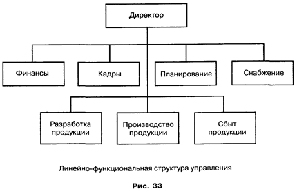 4.3. Типы организаций по взаимодействию подразделений По взаимодействию подразделений организации делятся на три типа: • традиционные организации; • дивизиональные организации; • матричные организации; • комбинированные (состоящие из элементов предыдущих трех). Традиционные организации могут иметь: • линейную структуру управления (рис.32); • линейно-функциональную структуру управления (рис.33); • линейно-штабную (линейно-функционально-штабную) структуру управления (рис.34).