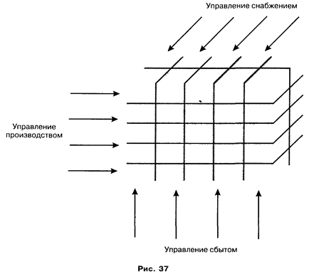 Дивизионы могут строиться: • по продукту (дивизионально-продуктовые структуры); • по региону (дивизионально-региональные структуры); • по потребителю-клиенту (дивизионально-потребительские структуры); • по рынку сбыта (дивизионально-рыночные структуры). Матричные организации — это организации, использующие работу автономных групп для запуска и внедрения нового продукта или проекта. Каждая автономная группа создается под цель или проект и пользуется при этом определенной свободой в организации своей работы. Они могут самостоятельно приобретать ресурсы, распределять полученную продукцию, участвовать в организации своего труда (рис.36).