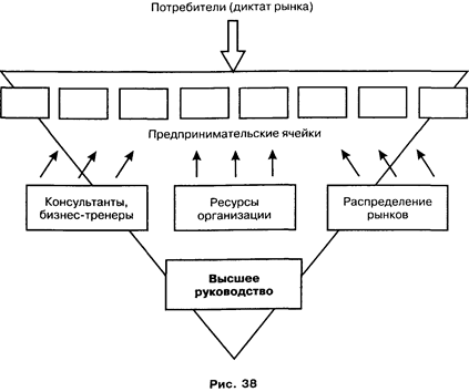 • принципиально изменяются функции руководства, оно поддерживает усилия предпринимательских ячеек, делающих бизнес, управление представляет собой перевернутую пирамиду; • предпринимательские ячейки (автономные рабочие группы — центры прибыли, по статусу могут быть фирмами или компаниями), сами выбирают вид предпринимательства, вид бизнеса, цели, способы, средства деятельности; потребности рынка диктуют им формы деятельности; • консультанты (бизнес-тренеры) помогают им своим опытом и интуицией делать бизнес; • ресурсы организации (финансы, информация, кадры, время, идеи) находятся в распоряжении предпринимательских ячеек; • подразделения, распределяющие рынки и ресурсы для предпринимательских ячеек, координируют деятельность последних; • критическим фактором успеха в таких организациях являются люди, их квалификация. ОРГАНИЗАЦИИ, ОРИЕНТИРОВАННЫЕ НА РЫНОК. Это органические, быстро адаптируемые дивизиональные или матричные организации, в которых все их части (НИОКР, производство, кадры, маркетинг, снабжение, сбыт, финансы, обслуживание) группируются вокруг рынка или рынков. Это организации, «движимые рынком» (рис.39, 40). Пример: корпорацияIBM (в 1985 г перешла от «продуктизации» к «регионализации» управления). Функции штаб-квартиры корпорации: • стратегическое развитие корпорации; • исследования и передовые разработки; • контроль распределения и использования финансов; • персонал; • работа с информацией (поступающей от филиалов и из внешней среды); • общемировая координация.