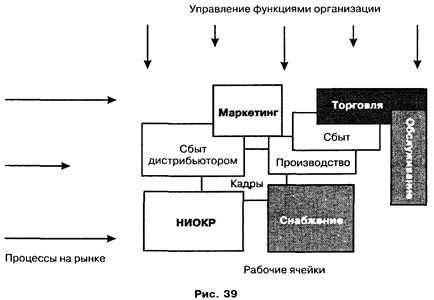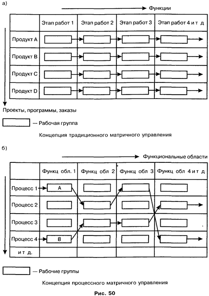 Проблемы: • необходима координация исполнением программ по срокам, исполнителям и целям; • необходимо правильное распределение прав, ответственности и ресурсного обеспечения. Проблемно-ориентированные методы управления используют в сложных нештатных ситуациях (экономические кризисы, потери рынков сбыта, стихийные бедствия, аварии, чрезвычайные ситуации). В частности: • выделяются сложные критические ситуации — проблемы, которые могут возникнуть в будущем и которые необходимо быстро решить; • для каждой из ситуаций разрабатываются возможные сценарии (схемы, алгоритмы) развития событий, делаются оптимистический и пессимистический прогнозы; • разрабатываются сценарии ответных действий на возможные нештатные ситуации; основная цель — минимизация потерь и быстрейшее спасение самого ценного. В таких ситуациях основной критический ресурс — время, на первый план выходит умение оперативно управлять временем. Специальные тренировки, сборы, тренинги позволяют скоординировать действия подразделений и руководства в нештатных ситуациях, выявить и проанализировать ошибки в ответных действиях. 5.7. Новые технологии управления В основе новых управленческих технологий лежат концепции инжиниринга и реинжиниринга бизнеса. Общее управление деловыми (бизнес) процессами называют инжинирингом бизнеса, ибо в его основе — непрерывное проектирование унифицированных процессов: их наименования, содержания, входа, выхода, обратных связей и т.д. Реинжиниринг — это перестройка (перепроектирование) бизнес-процессов с целью достижения качественного (скачкообразного) повышения эффективности деятельности фирмы. Последний термин появился в начале 1980-х гг. и связан с перестройкой деловых процессов поставок в компанииFord Motors и процессов оплаты счетов в компанииIBM Credit. Основателем теории реинжиниринга считают М. Хаммера (перу которого в соавторстве с Дж. Чампи принадлежит бестселлер «Реинжиниринг корпорации: манифест для революции в бизнесе»). На современном этапе развития компьютерных и телекоммуникационных технологий правомерно говорить и о принципиально новых технологиях управления унифицированными бизнес-процессами на базе матричных структур. Определяющими факторами обеспечения конкурентного преимущества матричной организации становятся скорость модификации, качество продукта и минимизация издержек. На первый план выходит проблема разработки технологии управления, позволяющей находить экономичные (по времени и затратам ресурсов) и качественные маршруты исполнения заказов. На смену концепции группировки работ вокруг продукта и результата (как в традиционных, матричных организациях) приходит концепция группировки работ вокруг функциональных областей и бизнес-процессов (рис.50).