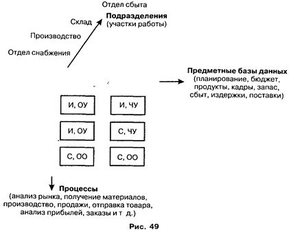 Ключи к модели организации: · И — предметная БД используется в конкретном процессе и на конкретном участке; · С — предметная БД создается в конкретном процессе работы на конкретном участке. Ключи полномочий: · ОО — руководитель подразделения — основной ответственный за процесс; · ОУ — подразделение — основной участник процесса; · ЧУ — частичное участие подразделения в процессе. Например, процесс «закупочная деятельность» использует БД «материалы», состоящую из 7 полей. Эта БД создается в процессе «получение материалов». Ответственность за эти процессы несет руководитель отдела снабжения (см. табл.):