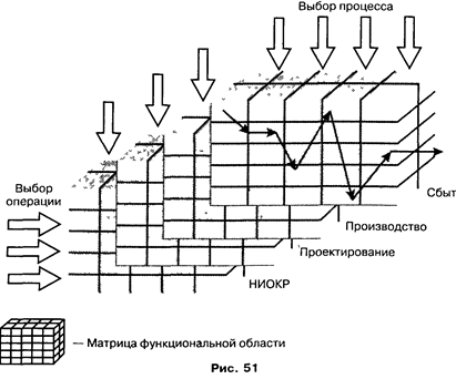 В традиционной матричной системе управления производство нового продукта предполагает построение новой линии матрицы или перестройку рабочих групп под новый заказ, что ведет к дополнительным затратам (рис.50а), видно, что управление осуществляется по двум векторам: управление запуском проектов-заказов и управление этапами работ (идея, НИОКР, проектирование, производство и т.д.). Новая концепция предусматривает управление унифицированными процессами (а не ходом проектов по выстроенным заранее линиям матрицы), посредством которых реализуется множество различных проектов (заказов, продуктов). Управление ведется по двум векторам: управление функциональными областями и управление унифицированными процессами. В качестве функциональных областей (ФО) рассматриваются не только укрупненные «НИОКР», «Проектирование», «Производство» и т.д., но и более мелкие, например в проектировании: «Эскизное проектирование», «Конструкторское проектирование», «Технологическое проектирование»; в производстве: «Заготовительное производство», «Механообработка», «Физико-химическое производство», «Сборочное производство» и т.д. Каждая ФО имеет допустимое множество унифицированных процессов, посредством которых реализуется тот или иной заказ, причем, множество различных заказов в матрице не требует дополнительного построения линий матрицы (например, из рис.50б следует, что заказ А может быть реализован в матрице по маршруту 11-22-13-44, а заказ В по маршруту 41-32-33-24). Повышение уровня разделения труда позволяет перейти и к трехмерным матричным схемам: функциональные области—процессы—операции (трудовые действия). Данная схема представлена на рис.51.