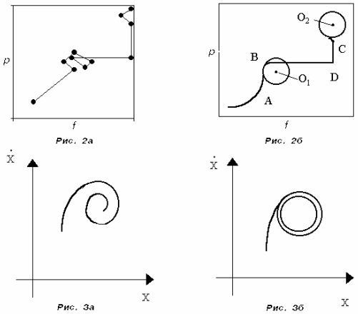 Например, в данном случае речь идет о зависимостях производительности труда и фондовооруженности от времени. Поэтому представляется интересным расставить все точки (Рис. 1а) в хронологическом порядке (заметим, что на Рис. 1б тоже есть упорядоченность по времени, но не для отдельных точек, а для совокупностей точек, лежащих близко друг к другу). Как видно на Рис. 2а, получается ломаная линия с петлями. Сгладим ее немного (сохраняя при этом характерные черты). На кривую, изображенную на рис. 2б, уже приятно смотреть. Посмотрим на нее. Сразу видно, что отклонения от магистрального направления располагаются не случайно, а образуют петли. Те, кто знакомы с теорией колебаний (хотя бы издалека видели хоть одну книгу) без труда узнают в этих петлях фазовый портрет осциллятора1 (его часто рисуют на обложках), причем, скорее всего, не простого осциллятора, изображенного на Рис. 3а, а осциллятора, совершающего автоколебания2 . Причем, положение равновесия, около которого происходит колебание, - перемещается: сначала оно находилось в точке A , потом в результате какого-то воздействия (по-видимому, - внешнего) переехало в точку C . И переезд был не простой – сначала резкий скачок f , а потом (вызванное, по-видимому, этим скачком) изменение p . _____________________________________________________________________________________ 1 Тело, совершающее колебательное движение, называют осциллятором. Состояние осциллятора в каждый момент времени определяется двумя величинами – координатой x и скоростью v и изображается точкой на фазовой плоскости – плоскости переменных x и v . Кривая, составленная из точек, соответствующих состояниям осциллятора за какой-то промежуток времени, называется фазовым портретом данного осциллятора. Например, на Рис. 3а изображен фазовый портрет осциллятора с затуханием (затухание может быть вызвано, например, трением) - спираль, закручивающаяся к положению равновесия. 2 Автоколебания – это незатухающие колебания; их энергия постоянно восполняется из внешнего источника; вид и свойства этих колебаний зависят от параметров самого осциллятора, но не от начальных условий. Фазовый портрет автоколебаний - предельный цикл (Рис. 3б) - замкнутая фазовая кривая, к которой стремятся все соседние кривые. Предельный цикл обладает важным свойством структурной устойчивости – его нельзя “разрушить” внешним воздействием. Для изменения или уничтожения предельного цикла надо изменить параметры осциллятора.