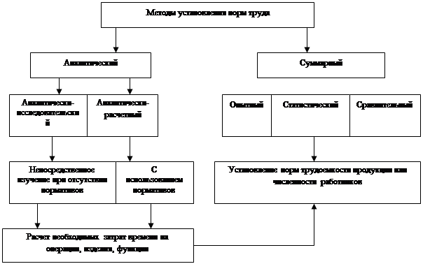 Аналитический метод предусматривает предварительное изучение трудового процесса, эффективности использования техники и рабочего времени. При этом методе используются два различных подхода - аналитически-исследовательский и аналитически-расчётный, различающиеся способом определения затрат времени. Аналитически-исследовательский метод применяется для определения затрат на каждый элемент операции и на операцию в целом на основе исследования этих затрат на рабочих местах и критического их анализа. (Затраты рабочего времени изучаются либо путём непосредственного измерения длительности каждого элемента работы и перерывов в работе, либо методом выборочного анализа рабочего времени). Аналитически-исследовательский метод применяется при отсутствии базовых нормативов или если они не могут быть использованы из-за несоответствия конкретным условиям. Аналитически-расчётный метод предусматривает установление затрат времени на операцию и её отдельные элементы не путём измерения, а по заранее разработанным базовым нормативам различной степени укрупнения (межотраслевого, отраслевого и местного уровней). При этом следует иметь в виду: если машинные элементы операции и связанные с ними затраты времени требуют технического обоснования (поскольку они обусловлены режимами работы оборудования) - отсюда и распространённое понятие технически обоснованных норм, то в отношении трудовых элементов прежде всего необходимо эргономическое и психофизиологическое обоснование. Суммарный метод характеризуется тем, что норма определяется на работу, операцию, продукт или функцию в целом, а не на составные элементы. Трудовой процесс, как правило, не анализируется; рациональность приёмов и методов труда, затраты времени на их выполнение не изучаются. Существуют следующие способы определения норм суммарным методом: опытный - на основе опыта нормировщика; статистический - на основе статистического учёта фактических затрат труда (времени или численности работников); сравнительный - путём сравнения сложности и объёма нормируемой работы с аналогичными, выполнявшимися ранее. Суммарный метод в чистом виде не может служить научной основой установления норм труда, но заложенный в нём опыт позволяет его использование в качестве ориентира при усреднённой оценке существующего состояния. На этом основана возможность соединения его с аналитическим путём проведения выборочных исследований затрат труда или использования нормативов на отдельные репрезентативные работы (операции, изделия, функции) с целью корректировки расчётов суммарных норм трудоёмкости продукции или численности работников, выполняющих ту или иную функцию. Установление норм труда и внесение изменений в них обусловлено следующим: работа новая, ранее не выполнялась (новизна работы) (новое изделие, операция или вид деятельности); изменение материала или метода работы, требующее установления новой нормы времени; наличие жалоб от работников или их представителей на допущенное занижение норм времени на операцию; данная операция стала" узким местом ", сдерживающим последующие операции или (вследствие накопления работы до неё) и предшествующие; нормы требуются прежде, чем введены стимулирующие системы оплаты труда; оборудование не работает в течение времени, превышающего ус