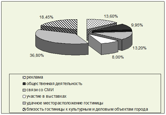 Для исследования была использована пятибалльная шкала, ответы приведены к среднему арифметическому показателю. Как видно из таблицы 2.1., анализ был проведен с позиции «сверху» посредством опроса руководителей, с позиции «сбоку» посредством опроса персонала гостиницы и с позиции «извне» посредством опроса клиентов. Месторасположение гостиницы оценивается всеми тремя группами удовлетворительно, наибольшая оценка выставлена руководством – 4,260 баллов. Предлагаемые услуги и удобства гостиницы оценены персоналом гораздо ниже, чем руководством и клиентами. Следовательно, наиболее точной оценкой является мнение персонала, т.к. именно сотрудники гостиницы знают досконально все процессы обслуживающего характера. Что касается внешнего восприятия гостиницы – наиболее адекватным является мнение клиентов – 3,01 балла, что существенно ниже, чем у руководителей и персонала гостиницы. Внутренняя атмосфера отеля оценена удовлетворительно по всем трем группам респондентов: персонала, клиентов, руководителей. Квалификация обслуживающего персонала наиболее адекватно оценена клиентами гостиницы и руководителями – 4,81 и 4,178 баллов соответственно. Данный показатель говорит о высокой степени квалификации персонала, что благоприятно сказывается на имидже организации. Среди средств внешней коммуникации и PRгостиницы «СПА-Отель РАССТАЛ» можно назвать рекламу, общественную деятельность, связи со СМИ, участие в выставках, удачное месторасположение гостиницы, ее близость к культурным, деловым объектам города (см. рис.2.2). Как видно из рисунка 2.2., приоритетным средством внешней коммуникации и PRгостиницы «СПА-Отель РАССТАЛ» является удачное месторасположение гостиницы – 36,8%, далее по убыванию следует ее близость к культурным, деловым объектам города – 18,45%, связи со СМИ (13,2%) и реклама (13,6%). Общественная деятельность и участие в выставках – наименее популярные способы внешней коммуникации и PR.