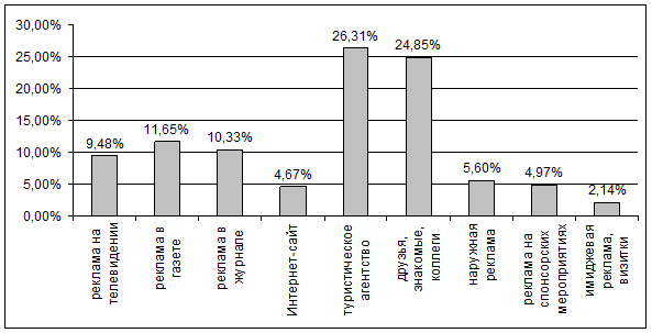 Рис. 2.2. Соотношение средств внешней коммуникации по формированию имиджа гостиницы «СПА-Отель РАССТАЛ» Автор рассмотрел рекламные аспекты деятельности гостиницы «СПА-Отель РАССТАЛ». Гостиница выпускает свою полиграфическую продукцию в виде проспектов, визиток, фирменных бланков, конвертов и т.п. В рекламных проспектах изображены красивые и цветные виды основных подразделений гостиницы и дано их краткое описание. Таким образом, ознакомившись с рекламным проспектом, потенциальный клиент может составить определенное представление еще до посещения гостиницы. Чаще всего ожидаемое представление совпадает с реальным, т.к. рекламный проспект несет правдивую, исчерпывающую информацию. Довольно часто печатаются статьи в газетах о пользе массажа, SPA-процедур, свадебных номеров и т.п. Плюсы рекламы в газетах: ей верят, большая аудитория, много места для описания подробностей, наличие разделов по интересам (спорт, светская хроника и т. д.), к ней можно вернуться и заново прочесть, объявление можно сохранить, можно использовать отрывные купоны; рекламу можно дать заранее. Однако минусы рекламы в газетах для гостиницы следующие: ее читают все меньше людей, стоимость рекламы растет быстрее, чем тиражи газет, рекламное объявление лишь одно из многих, средний читатель тратит лишь четыре секунды на страницу, воздействие ее на читателей от 18 до 34 лет слабое. Также функционирует красочный сайт гостиницы, где потенциальный клиент может просмотреть цены на услуги, основные акции и бонусы, внешний вид номеров и дополнительные услуги гостиницы. Забронировать номер и узнать контактную информацию для связи. Большое влияние PR в системе управления «СПА-Отель РАССТАЛ» может оказать упоминание в СМИ и на сайте такого факта, как проживание в гостинице знаменитых людей и артистов, о чем свидетельствует гостевая книга. Автором были проанализированы с помощью метода анализа документов ответы клиентов гостиницы о канале информации, по которому они узнали о гостинице «СПА-Отель РАССТАЛ». Ответы были обобщены в график (см. рис. 2.3). Как видно из рисунка 2.3., наибольше количество клиентов узнает о гостинице через туристические агентства – 26,31%, через друзей, знакомых, коллег – 24,85%. Это говорит о достаточно стабильных имиджевых характеристиках гостиницы. Реклама в газете – третий по значимости источник информации о гостинице – 11,65%, реклама в журнале немного отстает от газеты – 10,33%, реклама на телевидении уступает перечисленным каналом информации (9,48%). Вызывают интерес некоторые низкие показатели каналов информации, а именно Интернет-сайт (4,67%) и имиджевая реклама, визитки (2,14%). Это говорит о возможности развивать данные каналы информации, они могут работать намного эффективнее, нежели в данный момент времени.