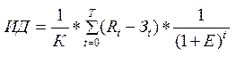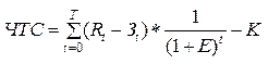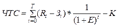 t – шаг в расчете; Rt – результаты на каждом шаге; Зt – затраты на t шаге без учета капитальных затрат; Е – норма дисконта; К – сумма приведенных капитальных вложений. Если ЧТС > 0, тогда проект прибыльный, если ЧТС < 0, тогда проект убыточный и нецелесообразный. Абсолютная величина ЧТС зависит от нормы дисконта (чем больше Е, тем меньше ЧТС),от затрат и результата, от периода и капиталовложений, т.е. от внутренних параметров проекта. «+»