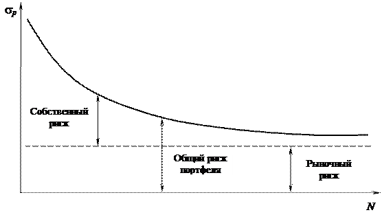 где rij – коэффициент корреляции доходностей i -ой и j -ой ценными бумагами; si , sj – стандартные отклонения доходностей i -ой и j -ой ценных бумаг. Для i = j ковариация равна дисперсии акции. Рассматривая теоретически предельный случай, при котором в портфель можно включать бесконечное количество ценных бумаг, дисперсия (мера риска портфеля) асимптотически будет приближаться к среднему значению ковариации. Графическое представление этого факта представлено на рисунке 3.