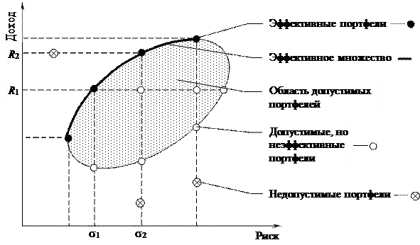 Рисунок 3. – Риск портфеля и диверсификация Совокупный риск портфеля можно разложить на две составные части: рыночный риск, который нельзя исключить и которому подвержены все ценные бумаги практически в равной степени, и собственный риск, который можно избежать при помощи диверсификации. При этом сумма вложенных средств по всем объектам должна быть равна общему объему инвестиционных вложений, т.е. сумма относительных долей в общем объеме должна равняться единице. Проблема заключается в численном определении относительных долей акций и облигаций в портфеле, которые наиболее выгодны для владельца. Марковиц ограничивает решение модели тем, что из всего множества «допустимых» портфелей, т.е. удовлетворяющих ограничениям, необходимо выделить те, которые рискованнее, чем другие. При помощи разработанного Марковицем метода критических линий можно выделить неперспективные портфели. Тем самым остаются только эффективные портфели. Отобранные таким образом портфели объединяют в список, содержащий сведения о процентом составе портфеля из отдельных ценных бумаг, а также о доходе и риске портфелей. Объяснение того факта, что инвестор должен рассмотреть только подмножество возможных портфелей, содержится в следующей теореме об эффективном множестве: «Инвестор выберет свой оптимальный портфель из множества портфелей, каждый из которых обеспечивает максимальную ожидаемую доходность для некоторого уровня риска и минимальный риск для некоторого значения ожидаемой доходности».[11] Набор портфелей, удовлетворяющих этим двум условиям, называется эффективным множеством. На рисунке 4 представлены недопустимые, допустимые и эффективные портфели, а также линия эффективного множества.