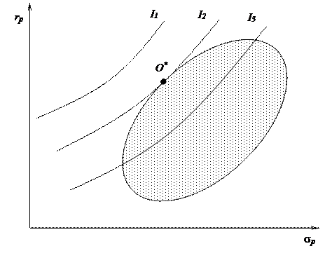 Инвестор должен выбирать портфель, лежащий на кривой безразличия, расположенной выше и левее всех остальных кривых. В теореме об эффективном множестве утверждается, что инвестор не должен рассматривать портфели, которые не лежат на левой верхней границе множества достижимости, что является ее логическим следствием. Исходя из этого, оптимальный портфель находится в точке касания одной из кривых безразличия самого эффективного множества. На рисунке 6 оптимальный портфель для некоторого инвестора обозначен O * .