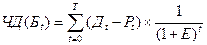 (1.4) где t – шаг расчёта (0, 1, ... Т); T – горизонт расчёта; Дt – достигаемый результат на t-ом шаге расчёта; Рt – осуществляемые затраты на t-ом шаге расчёта; Е – норма дисконта. Доходы бюджета состоят из: 1) налога на добавленную стоимость, специальных и иных налоговых поступлений с учётом предоставляемых льгот, рентных платежей отечественных и иностранных фирм (компаний) в части, относящейся к осуществлению инвестиционного проекта; 2) увеличения (уменьшения) налоговых поступлений от сторонних предприятий и организаций, финансовое состояние которых изменяется вместе с реализацией инвестиционного проекта; 3) поступающих в бюджет таможенных пошлин и акцизов по продуктам, производимым в соответствии с проектом; 4) эмиссионного дохода от выпуска ценных бумаг под осуществление проекта; 5) дивидендов по принадлежащим государству, региону акциям и другим ценным бумагам, выпущенным с целью финансирования проекта; 6) поступлений в бюджет подоходного налога с заработной платы российских и иностранных работников, начисленной за выполнение предусмотренных проектом работ; 7) поступлений в бюджет платы за пользование землёй, водой и другими природными ресурсами; 8) платы за недра, лицензии на право ведения геологоразведочных работ в части, зависящей от осуществления инвестиционного проекта; 9) доходов от лицензирования, конкурсов и тендеров на разведку, строительство и эксплуатацию объектов, предусмотренных инвестиционным проектом; 10) погашения льготных, выделенных за счёт средств бюджета, кредитов на проект и обслуживанию этих кредитов; 11) штрафов и санкций, связанных с проектом, за нерациональное использование материальных, топливно-энергетических и природных ресурсов; 12) поступлений во внебюджетные фонды (пенсионный фонд, медицинского и социального страхования) в форме обязательных отчислений по заработной плате, начисляемой за выполнение предусмотренных проектом работ. Расходы бюджета включают: 1) средства, выделяемые для прямого бюджетного финансирования проекта; 2) кредиты Приднестровского республиканского банка, региональных банков для отдельных участников реализации проекта, выделяемые в качестве заёмных средств, подлежащих компенсации за счёт бюджета; 3) прямые бюджетные ассигнования на надбавки к рыночным ценам за топливо и энергоносители; 4) выплаты пособий для лиц, остающихся без работы в связи с реализацией инвестиционного проекта; 5) выплаты по ценным бумагам государства; 6) государственные и региональные гарантии инвестиционных рисков иностранным и отечественным участникам; 7) средства, выделяемые из бюджета для ликвидации последствий возможных чрезвычайных ситуаций и компенсации иного ущерба от реализации инвестиционного проекта [43.С.146].
