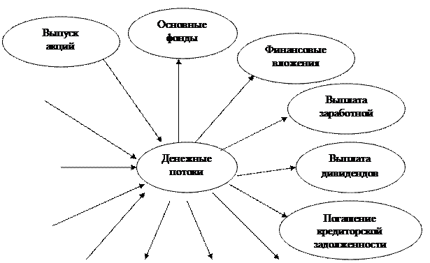 Для характеристики качества дебиторской задолженности определяется такой показатель, как доля резерва по сомнительным долгам в общей сумме дебиторской задолженности. Рост уровня данного коэффициента говорит о снижении качества последней. Качество дебиторской задолженности оценивается также удельным весом в ней вексельной формы расчетов, который может быть реализован третьему лицу до наступления срока его погашения. Вексельное обязательство имеет значительно большую силу, чем обычная дебиторская задолженность. Увеличение удельного веса полученных векселей в общей сумме дебиторской задолженности свидетельствует о повышении ее надежности и ликвидности. 4 Анализ движения денежной наличности Управление денежными средствами имеет такое же значение, как и управление запасами и дебиторской задолженностью. Сумма денежных средств , которая необходима хорошо управляемому предприятию, - это по сути дела страховой запас, предназначенный для покрытия кратковременной несбалансированности денежных потоков. Она должна быть такой, чтобы ее хватало для производства всех первоочередных платежей. Поскольку денежные средства, находясь в кассе или на счетах в банке, не приносят дохода, а их эквиваленты – краткосрочные финансовые вложения с низкой доходностью, их нужно иметь в наличии на уровне безопасного минимума. Увеличение или уменьшение остатков денежной наличности на счетах в банке обуславливается уровнем несбалансированности денежных потоков, т.е. притоком и оттоком денег. Превышение притоков над оттоками увеличивает остаток свободной денежной наличности, наоборот, превышение оттоков над притоками приводит к нехватке денежных средств и увеличению потребности в кредите. На рис. 3.1 стрелки, направленные внутрь, показывают притоки денежных средств, наружу – оттоки. Денежные потоки планируются для, чего составляется план доходов и расходов по операционной, инвестиционной и финансовой деятельности на год с разбивкой по месяцам. Как дефицит, так и избыток денежных ресурсов отрицательно влияют на финансовое состояние предприятия. Наличие избыточного денежного потока приводит: 1) к потере реальной стоимости временно свободных денежных средств в результате инфляции; 2) к потере части потенциального дохода от недоиспользования денежных средств в операционной или инвестиционной деятельности; 3) замедлению оборачиваемости капитала. Чтобы деньги работали на предприятие необходимо: 1) расширять свое производство, прокручивая их в цикле оборотного капитала; 2) обновлять основные фонды, приобретать новые технологии; 3) досрочно погасить кредиты банка и другие обязательства. Дефицит денежных средств приводит к росту просроченной задолженности предприятия по кредитам банку, поставщикам, персоналу по оплате труда в результате чего увеличивается продолжительность финансового цикла и снижается рентабельность капитала. Уменьшить дефицит можно за счет следующих мероприятий: 1) ускорить поступление денежных средств путем перехода на полную или частичную предоплату продукцию покупателями, сокращения сроков предоставления им товарного кредита, привлечения кредитов банка и т.д. 2) замедление выплаты денежных средств достигается за счет приобретения долгосрочных активов на условиях лизинга, переоформления краткосрочных кре