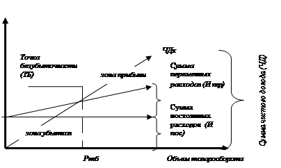 Рис.1.3 График формирования точки безубыточности операционной деятельности торговой организации Из приведенного графика видно, что для достижения «точки безубыточности» своей торгово-операционной деятельности (ТБ) торговая организация должна обеспечить такой объем товарооборота (Ртб),при котором сумма чистого дохода сравняется с суммой расходов на реализацию – как постоянных, так и переменных. Это условие может быть выражено следующими равенствами (1.1, 1.2): ВДк = И + НДС, (1.1) ЧДк = И (1.2) где ТБ – точка безубыточности операционной деятельности; ВДк – сумма валового дохода (прибыли); ЧДк – сумма чистого дохода; И – совокупная сумма расходов на реализацию; НДС – сумма налога на добавленную стоимость. Соответственно стоимостной объем реализации товаров, обеспечивающий достижение точки безубыточности торгово-операционной деятельности организации в коротком периоде, может быть определен по следующим формулам (1.3,1.4):