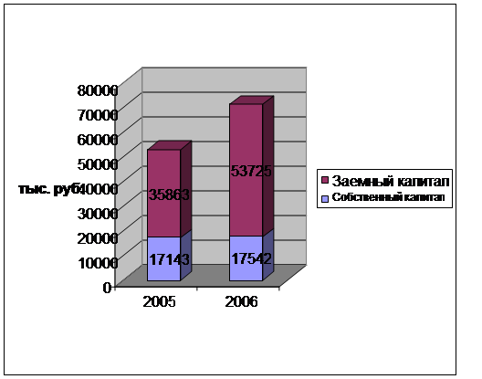 Рис. 3. Структура собственного капитала ООО «Восток - Л» в 2006 г. В структуре собственного капитала предприятия в 2006 г. также высока доля нераспределенной прибыли, которая имела тенденцию к увеличению. Абсолютная величина уставного и добавочного капиталов предприятия осталась неизменной. Уставный капитал предприятия составляет 8630000 руб. Предприятием размещены обыкновенные именные бездокументарные акции – 863000 штук, номинальная стоимость каждой составляет 10 руб. На рисунках 4 и 5 можно посмотреть структуру заемного капитала предприятия в 2005-2006 гг.
