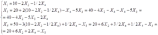 Базисное решение является допустимым, так как в правой части неравенств не содержатся отрицательные значения. В данной системе 3 – уравнения с 3 – неизвестными, принимают за основные X4 , X5, X6 – переменных. После этого выражают основные переменные (добавочные) через неосновные, и находят базисное решение соответствующее. Вводим добавочные неотрицательные переменные (которые еще называют «неосновные»), и сводим систему неравенств к эквивалентной системе уравнений.