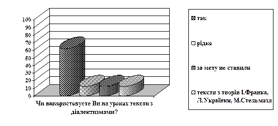 Одним із запитанням нашої анкети було таке: «Чи використовуєте Ви на уроках тексти, в яких вживаються діалектизми?» Всі респонденти зазначили, що використовують тексти, в яких є такий шар лексики. Але 62,5% опитаних відповіли лише коротко — так. 12,5% - використовують рідко, 12,5% - за мету не ставили підібрати текст із діалектизмами, проте від такого мовного матеріалу не відмовлялися. Ще 12,5% вчителів беруть уривки з творів І.Франка («Захар Беркут»), Л. Українки, М. Стельмаха («Гуси-лебеді летять»). Діаграма 3.2.3.Використання текстів з діалектизмами